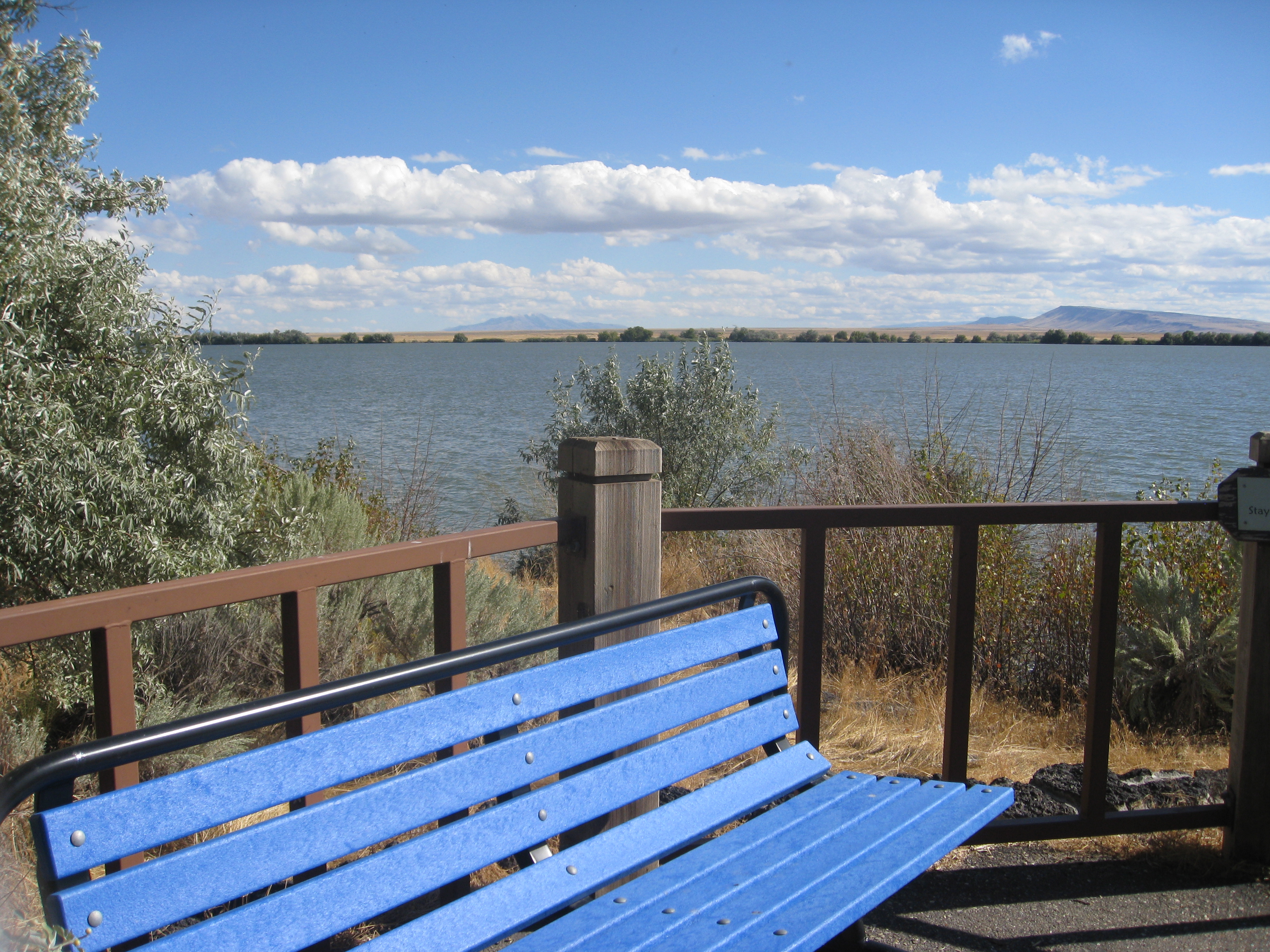 The day I sat on this blue bench at Lake Walcott State Park in Southern Idaho, two deer ambled among the trees off to my right, and a flock of white pelicans flew low over the lake on my left. -- Photo by Pat Bean