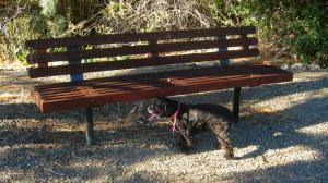 I think this is Maggie's way of saying "Let's rest a bit before going on." -- Photo taken by Pat Bean at Clyde Holliday State Park in Southern Oregon.