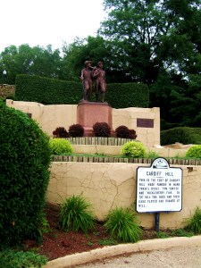 On my earlier trip to Hannibal — when it was sunny — I climbed the 253 steps to the top of Cardiff Hill. At the foot of the hill is a statue of Tom and Huck. — Photo by Pat Bean