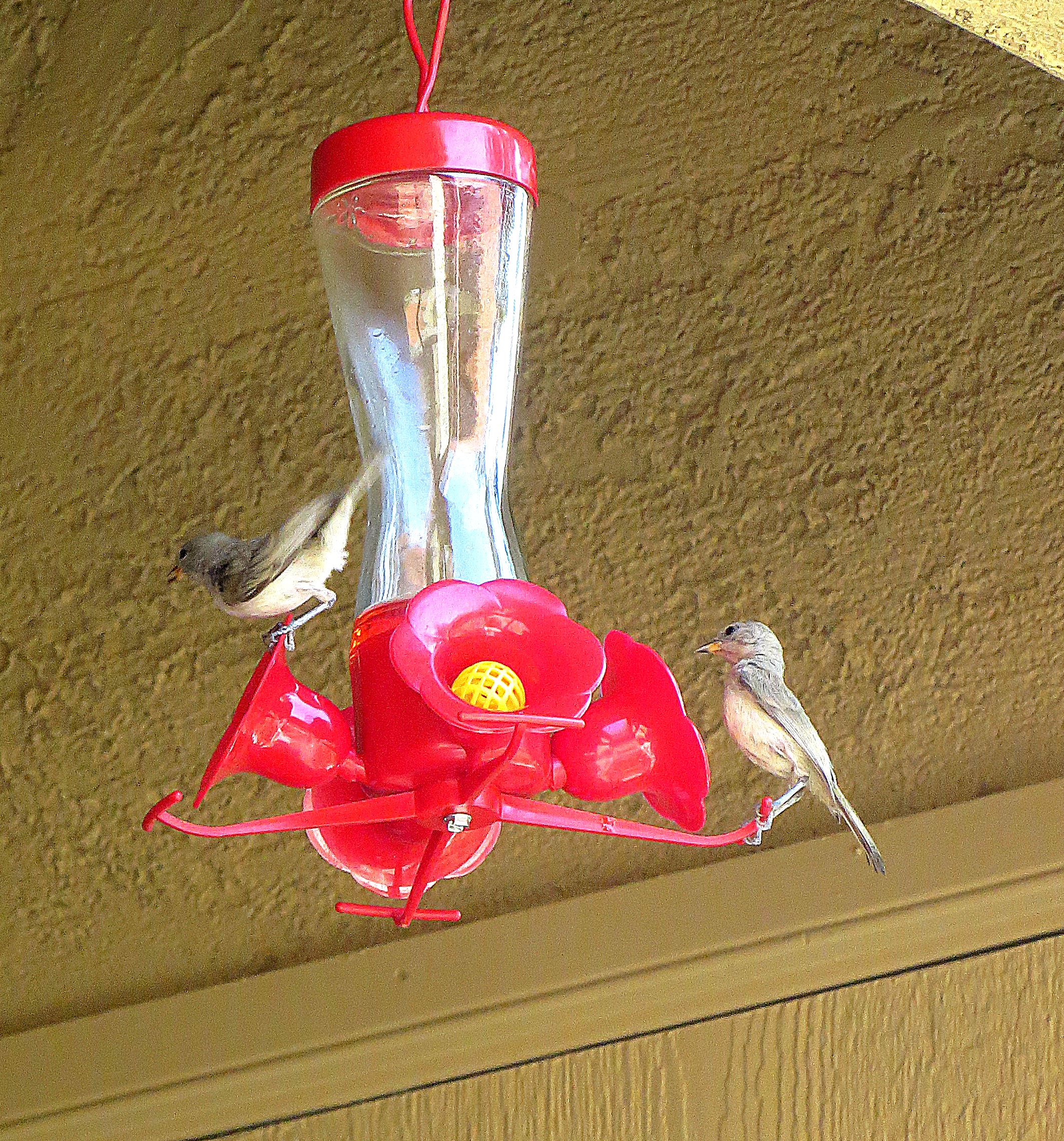 I hung a nectar feeder for hummingbirds from the roof of my third-floor balcony. The hummingbirds came, but then so did a flock of birds that clearly weren’t hummers.