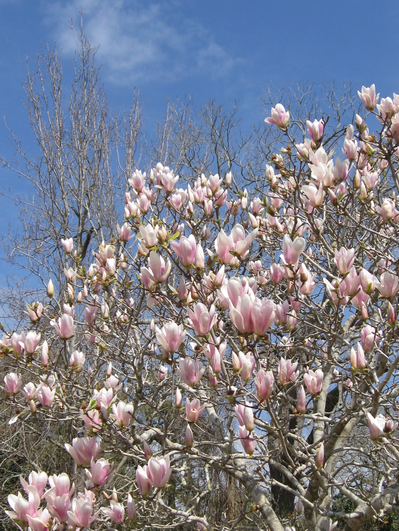 The Japanese magnolia, or tulip tree as it is sometimes called, is among the first harbingers of spring. Other trees here in Lake Jackson, well except for the evergreen live oak, are still lifeless, their naked branches serving as inviting perches for the chickadees, warblers, sparrows, waxwings, blue jays, robins, starlings, grackles, pileated woodpeckers, shrikes, cardinals and red-tailed and red-shouldered hawks that frequent my son’s neighborhood. I enjoy their easily viewable presence these winter-morphing-into-spring days, knowing that soon they will be able to hide from my sight among leafy shadows.