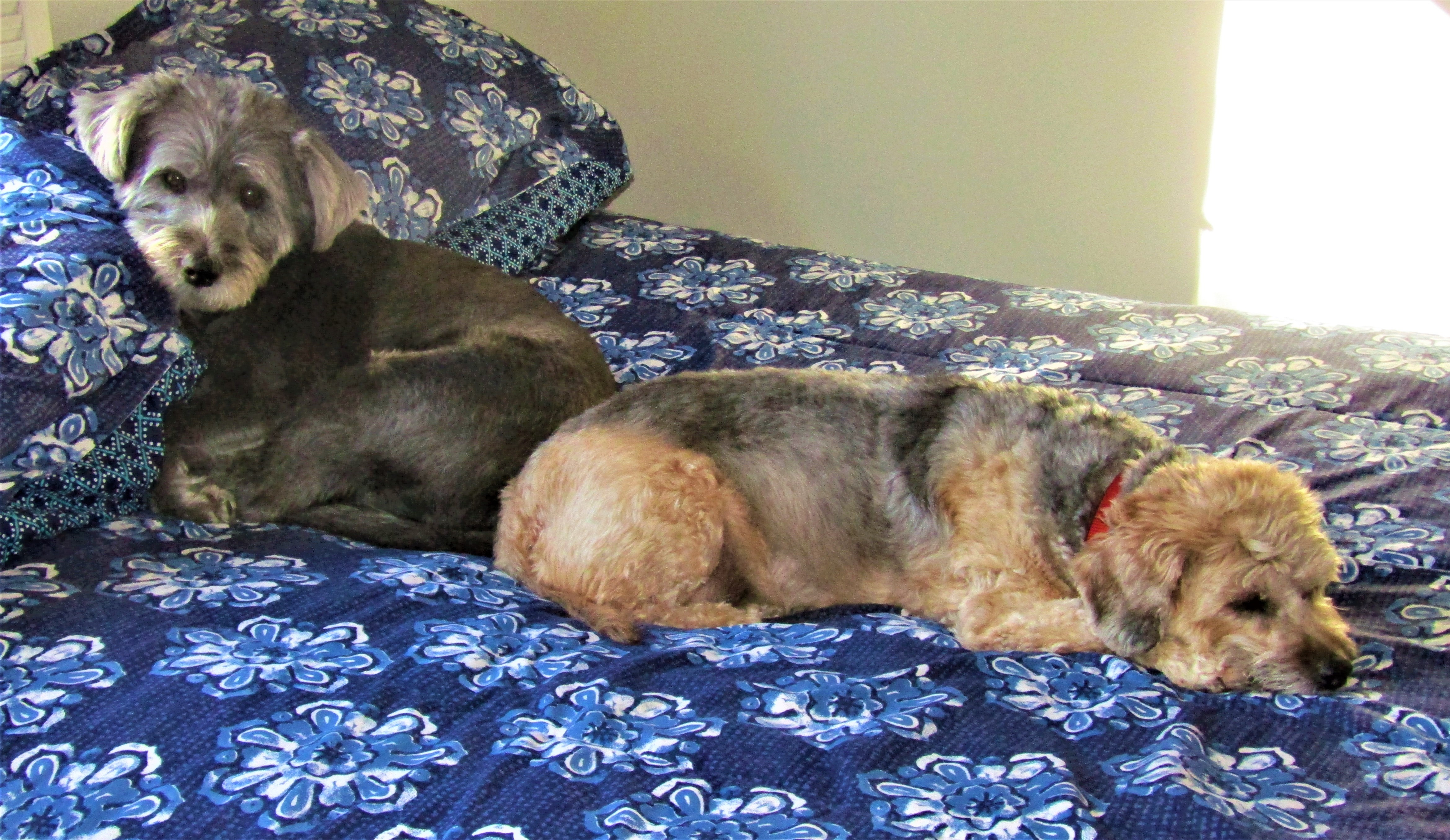 Scamp is the one with his head on the pillow. Sharing the bed with him is his best friend Dusty, whom I babysit while her owner is at work. Yup! You’ve noticed. They are pampered pets. — Photo by Pat Bean