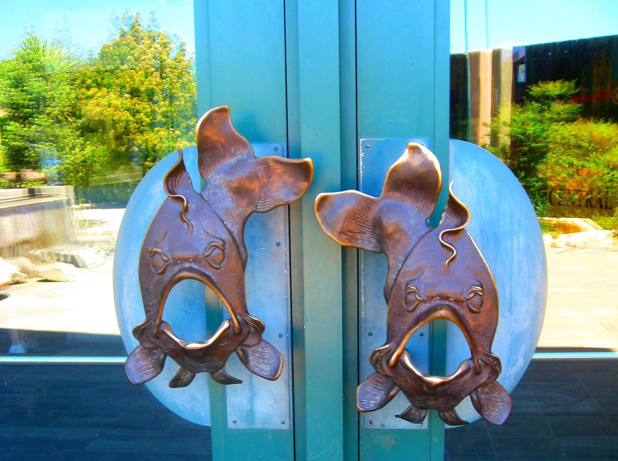 It was the attention to details, like these fish handles on the glass aquarium door that reflects the landscaped patio, that enhanced my enjoyment of my Albuquerque day. — Photo by Pat Bean