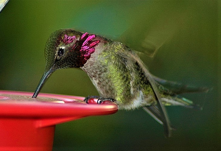In contrast, I almost daily see Anna’s hummingbirds, the male of which has a head that shimmers a brilliant magenta. I have one Anna’s that sits on a branch in the tree next to my front balcony — and attacks any other hummers that come in range. It’s quite a show to watch when he’s in residence.