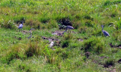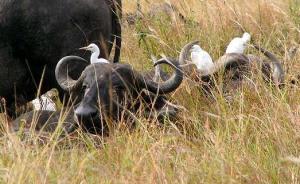 Water buffalo resting in the tall grass with cattle egrets for company. -- Photo by Kim Perrin