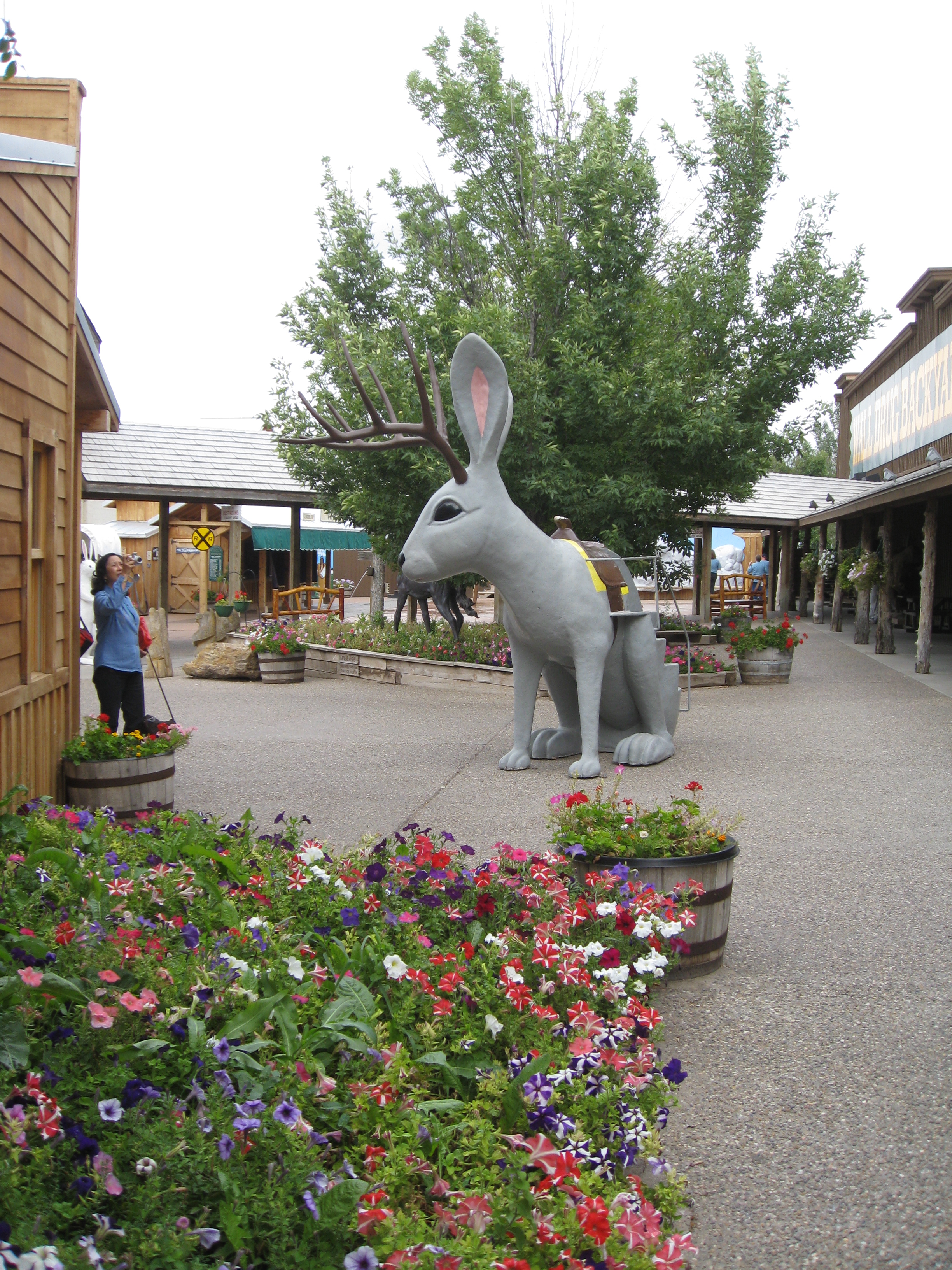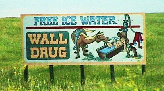Soon Highway 90 was littered with billboard signs touting the free water, and tourists found the offer too good to pass by. Today, they have many more reasons to stop. The huge Wall Drug complex, which has been written about in Time magazine, talked about on Good Morning America and touted on the Paris (France not Texas) Metro, includes a western art museum, cowboy themed shops, a quiet chapel, huge dinosaur and jackalope sculptures, and of course a small pharmacy.