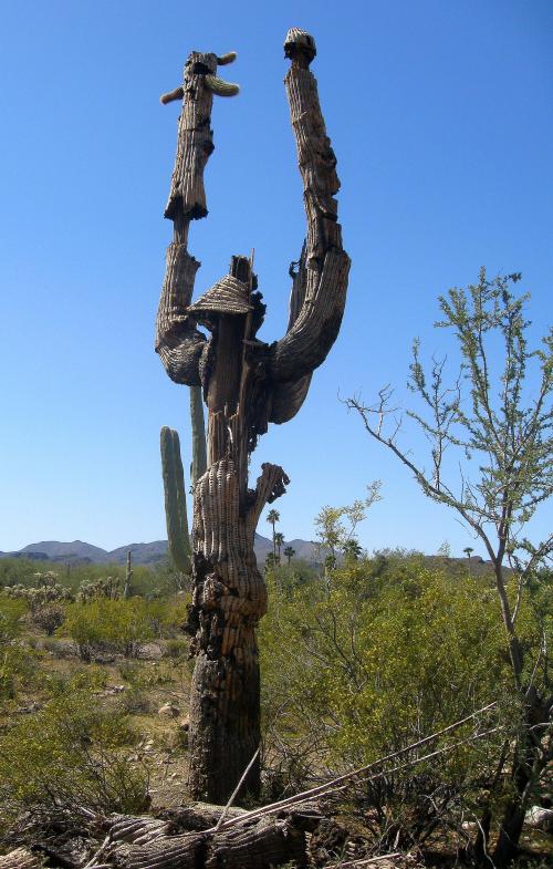 One of the many delightful things about living in Tucson are the Saguaros, a slow-growing cactus that at about the age of 50 develops tree-branch arms. The cactus then lives on for another hundred years or so, continuing to grow more arms and stretch up toward the sky.